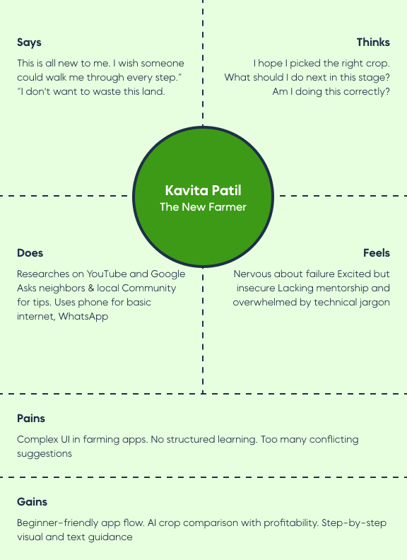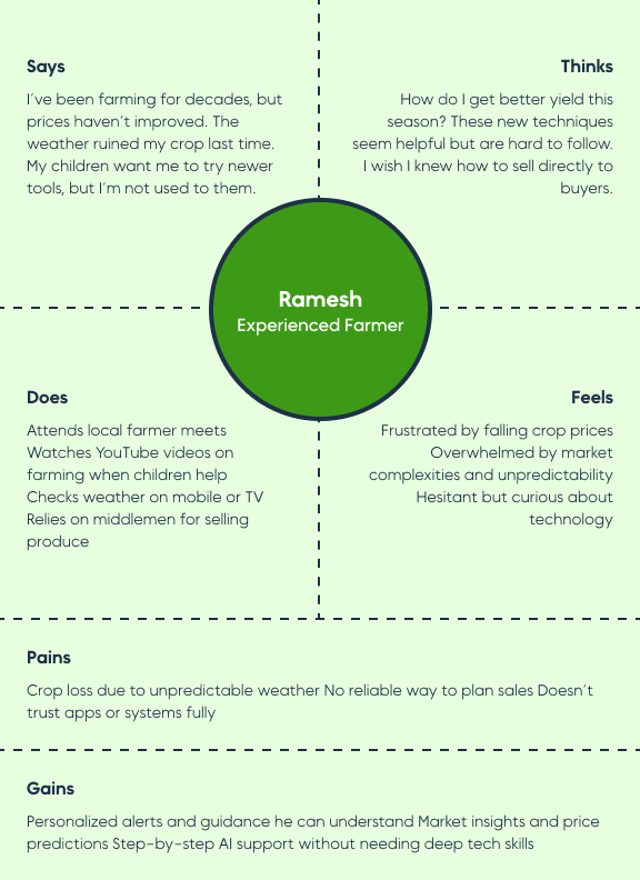 Design implication: Farmers need a localized, voice-first, offline-capable assistant that turns complex data (weather, prices, finance, schemes) into simple, daily, stage-wise actions.