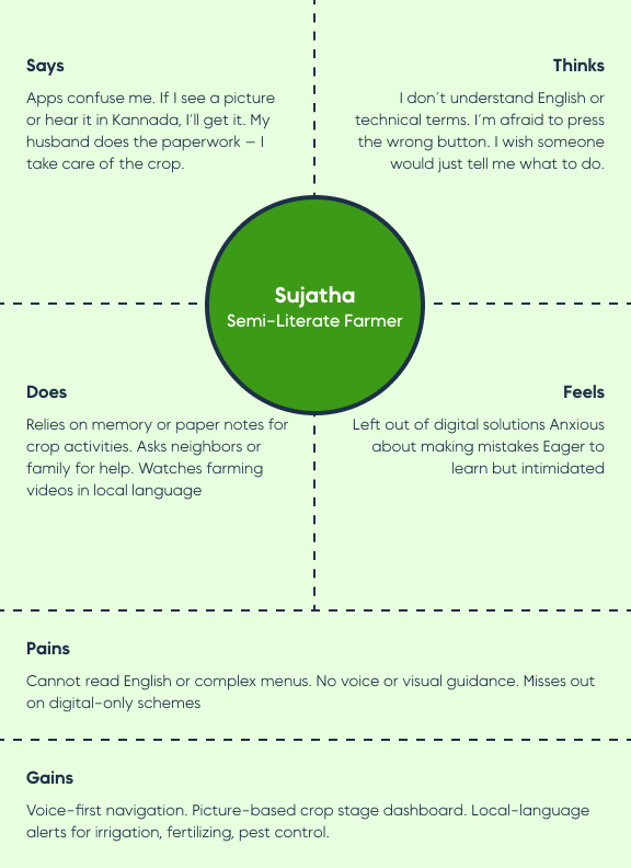 Most digital products assume literacy, stable internet, and digital familiarity. But for farmers like Sujatha and Kavita, visual, voice-first, and offline-first design is essential not optional.
